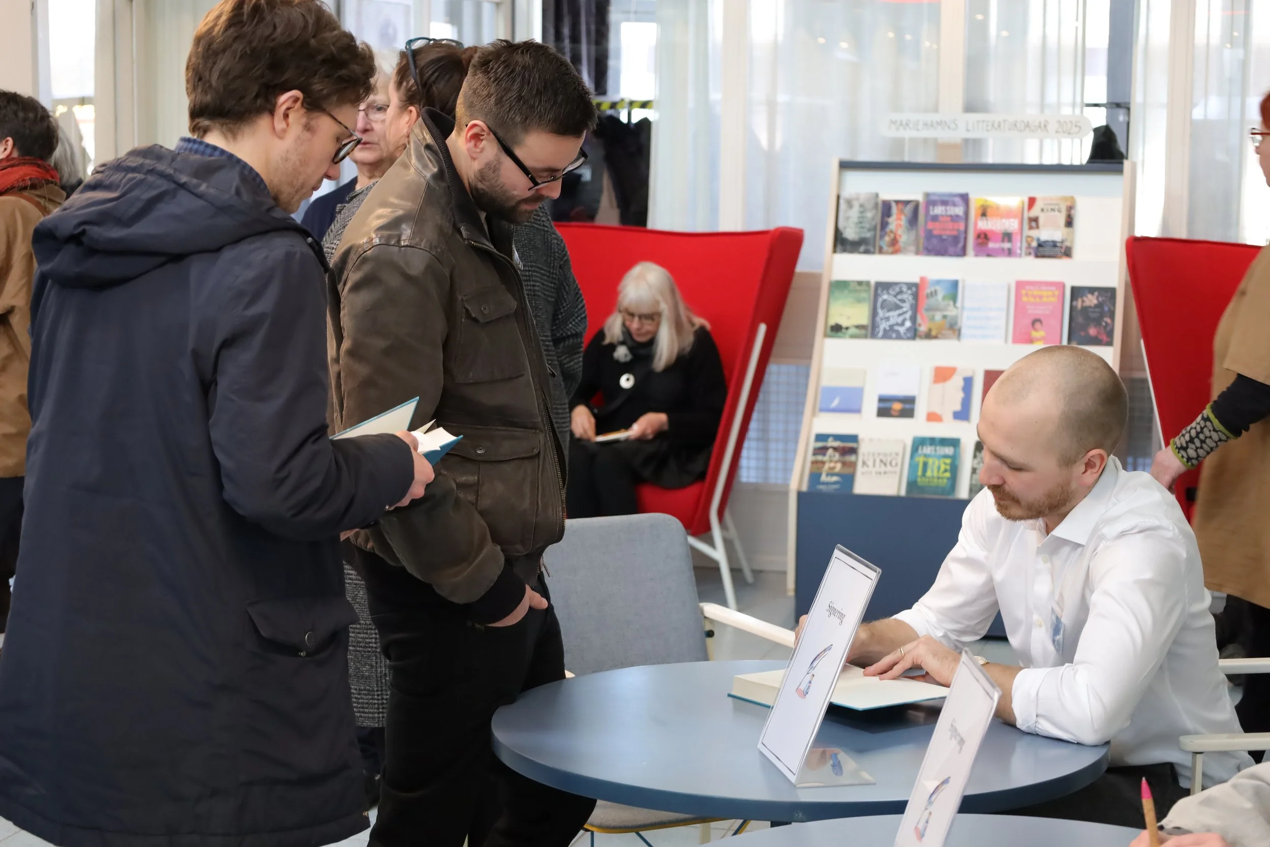 Librarias författare Magnus Selander signerar sin bok "Vi som blev kvar" på litteraturdagarna i Mariehamn 2025.
